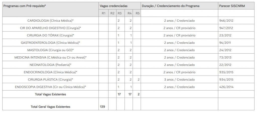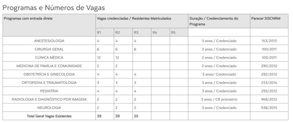 O Hospital, atualmente, possui 19 Programas de Residência Médica credenciados pela Comissão Nacional de Residência Médica – CNRM. Dentre eles, 9 com entrada direta e 10 com exigência de pré requisito.